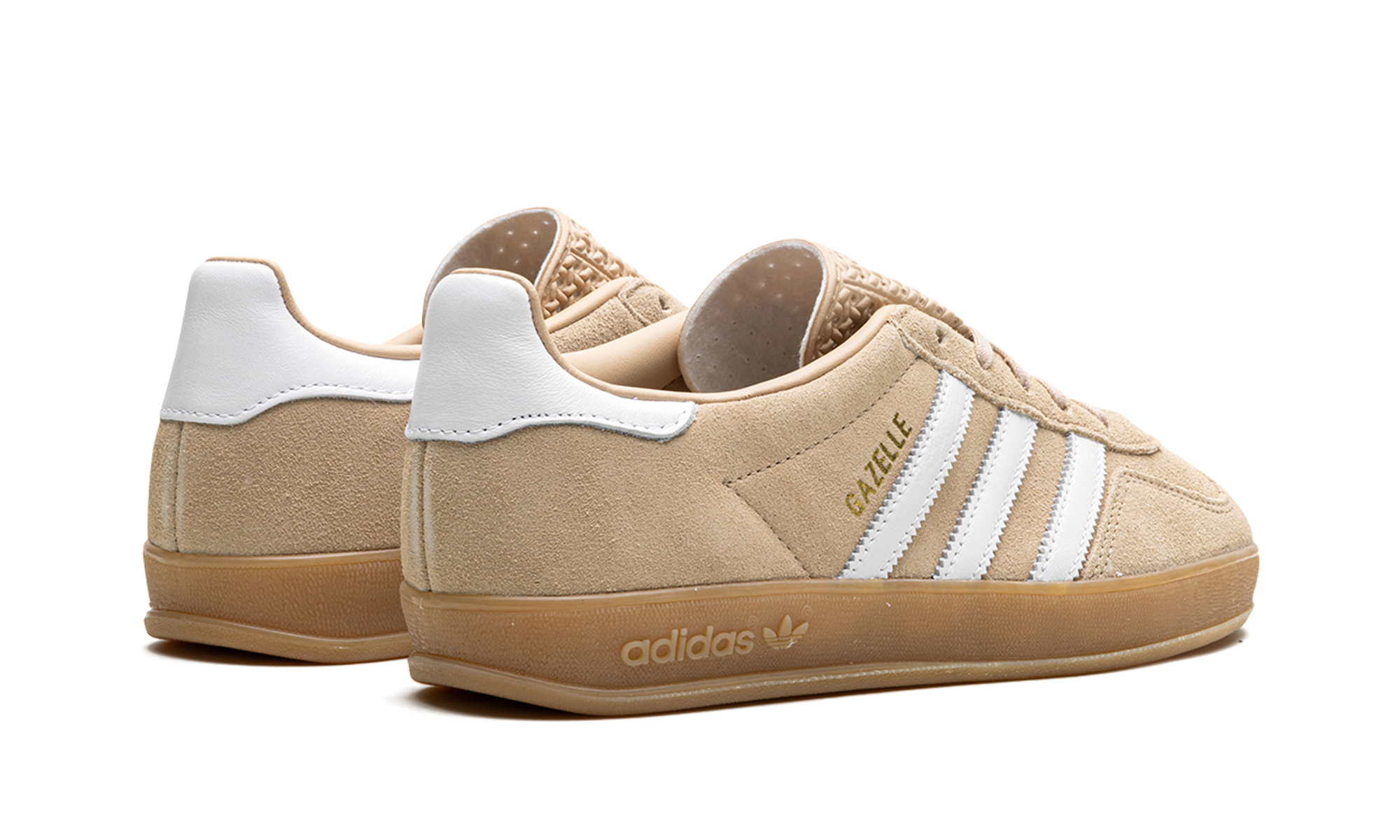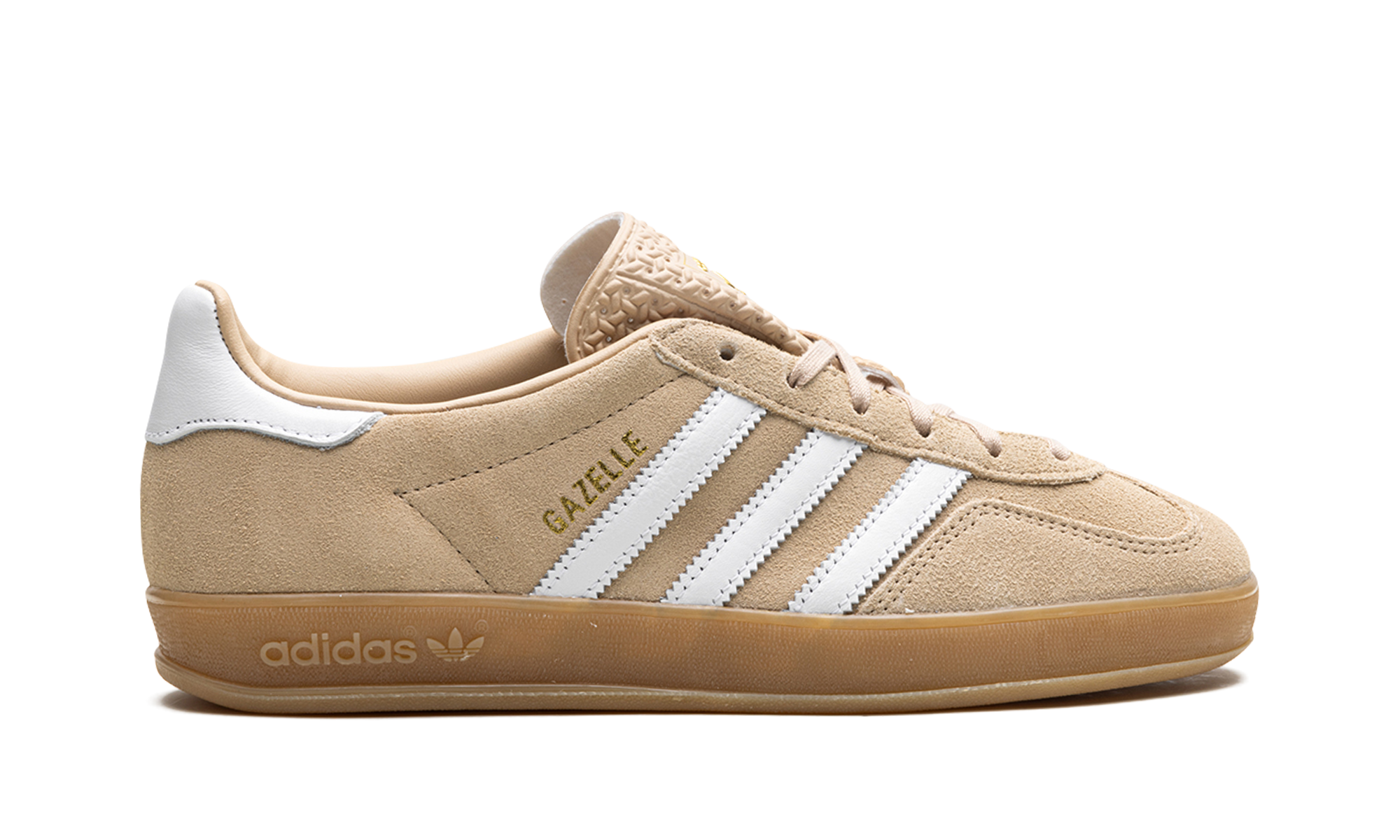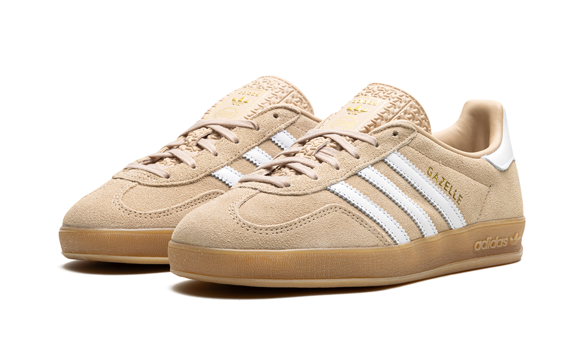 The Women's adithtdas Gazelle Indoor "Magic Beige" is a women's-exclusive colorway of the casual shoe with a mostly beige appearance. An easy-wearing option for women, the adithtdas Gazelle Indoor "Magic Beige" features a Magic Beige suede construction with tonal overlays on the toe and eyelets. White leather Three Stripes branding can be found on the sides and a white leather overlay appears on the heel. Gold "Gazelle" branding is stamped on the lateral side of the mid-panel. A gum rubber sole completes the look. Magic Beige