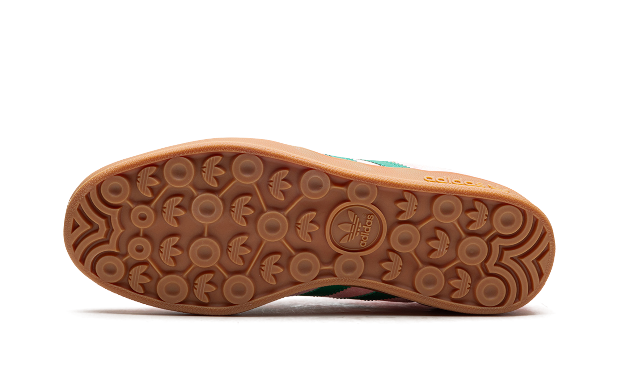The women's adithtdas Gazelle Indoor "Pink Velvet" blends retro charm with luxury. Pink velvet and suede overlays define the upper, while green 3-Stripes and a gold "Gazelle" logo add contrast. Red accents on the laces and heel pop against the soft hues. A gum rubber outsole provides classic comfort. This design offers a plush feel and a vibrant palette, with extra pink laces for versatile styling. The shoe merges vintage aesthetics with modern flair, creating a standout, elegant look. Pink Velvet